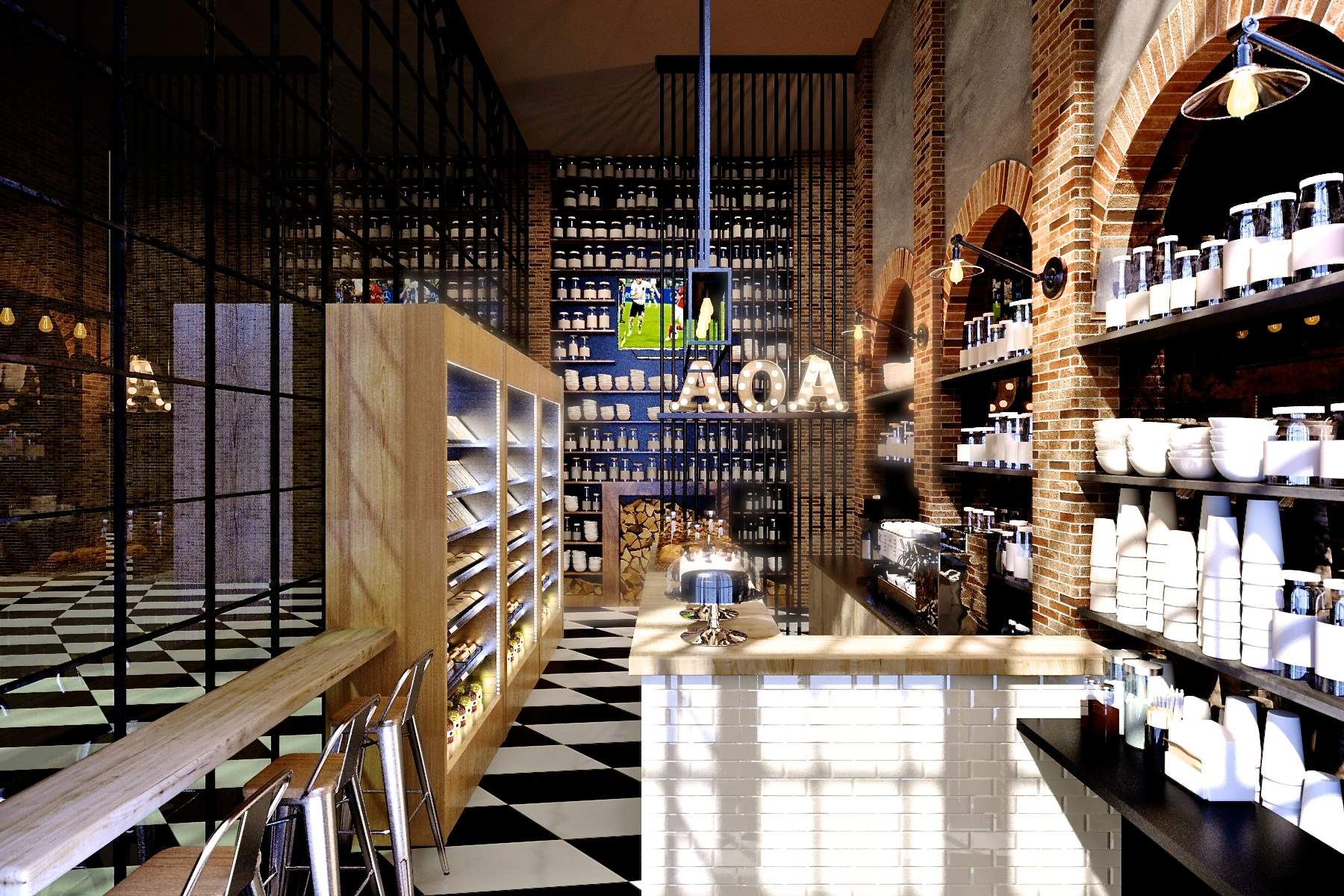 For AOA Express Takeout—a deli and bodega located in Tribeca, Manhattan—I developed a full conceptual design rooted in a distinctly NYC industrial-modern aesthetic. The space blends raw urban character with warm functionality, featuring exposed brick arches, black steel framing, and a bold checkerboard floor that anchors the interior. Custom millwork, integrated shelving, and illuminated displays create an organized yet inviting retail flow, while curated FF&E selections introduce natural wood tones and soft metal accents that balance the industrial grit. Thoughtfully planned lighting highlights both product and texture, enhancing the rhythm of the space and giving it a contemporary boutique-market feel. Every element—from the furniture and lighting plans to the finishes and 3D visualizations—was crafted to reflect a modern Tribeca sensibility with a polished, bodega-meets-loft atmosphere.